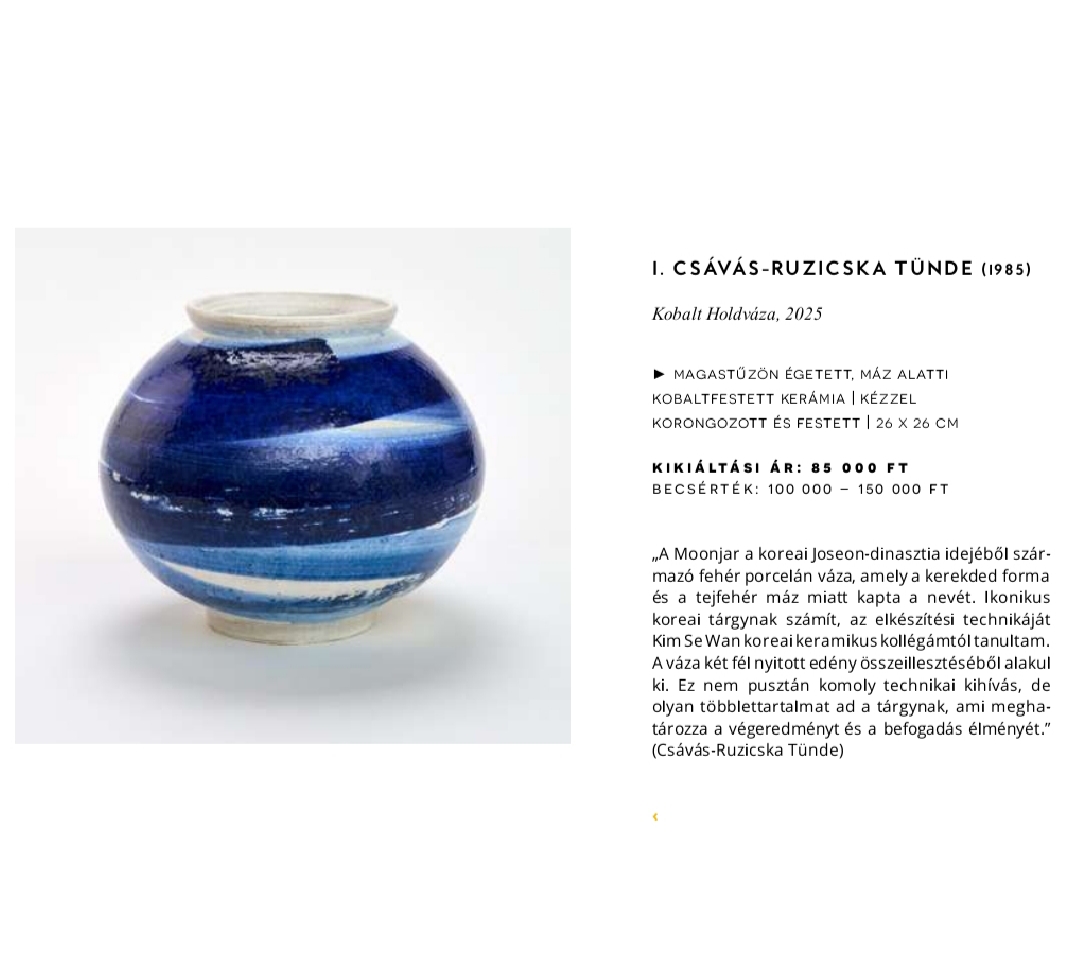Idén is felkérést kaptam a 10. Art Craft Design Aukcióra, mely minden évben a Mosoly Alapítvány munkáját támogatja, hátrányos helyzetű gyermekek művészetterápiás módszerének gyógyításával. Idén ezzel a kobaltfestett Moonjar-azaz Holdvázával készültem, mely sikeresen szerepelt.