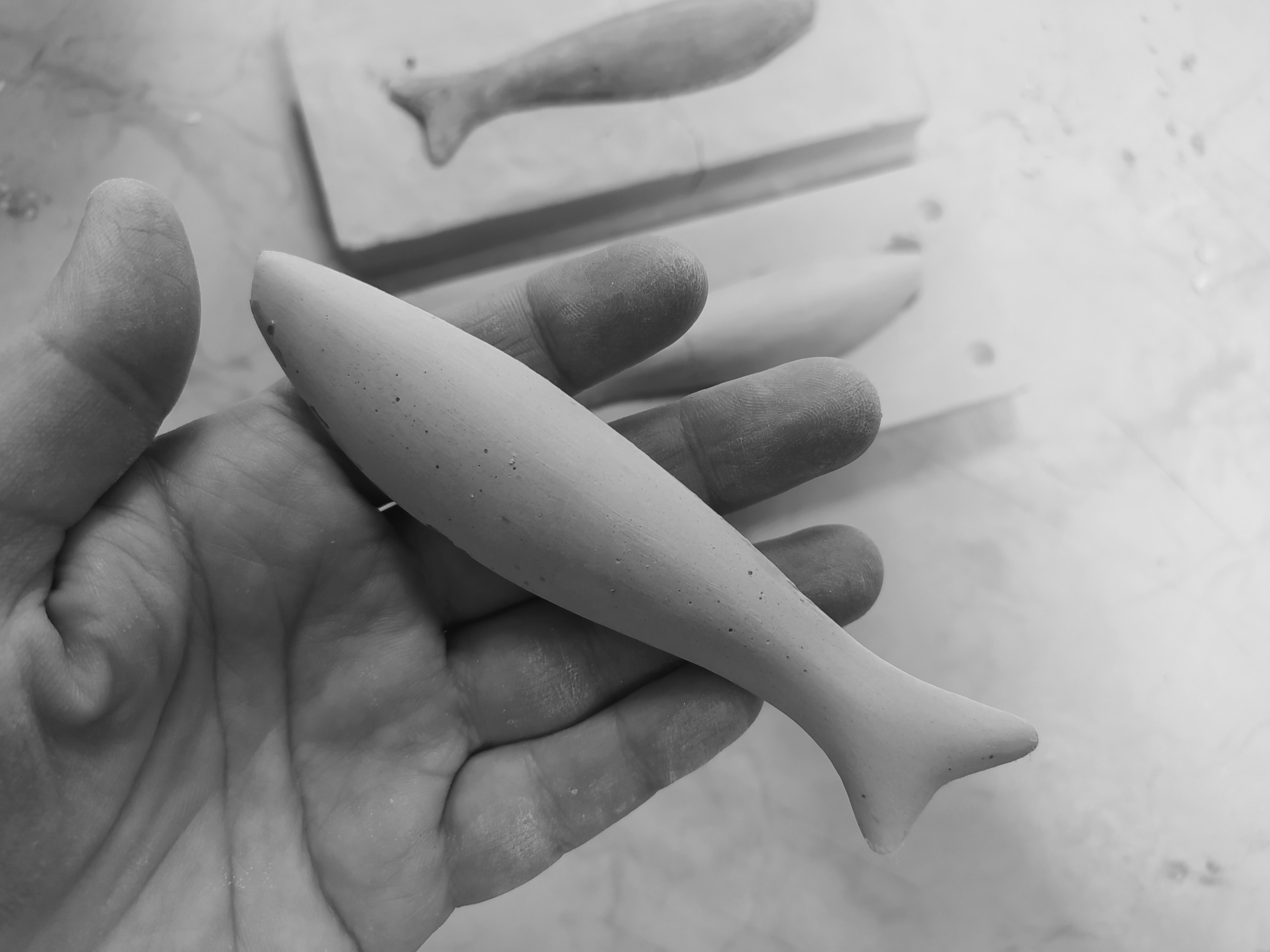 A szimpóziumon ezzel a technikával egy új formai irányt próbáltam ki: kisebb halformákat mintáztam és öntöttem, amelyeket az MMA művészeti ösztöndíjas időszak során végzett munkámban tovább kívánok használni.