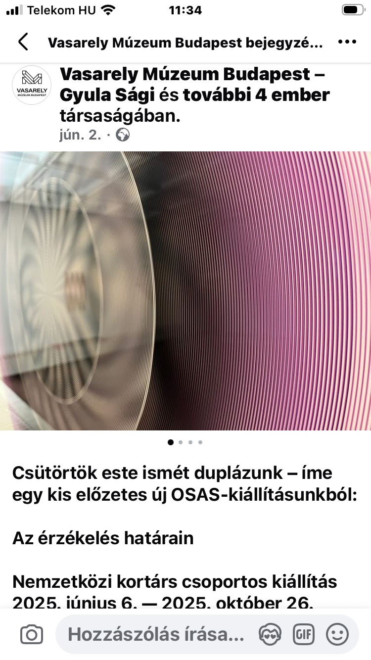 Csoportos nemzetközi kiállítás az Érzékeléssel, látással, láthatósággal kapcsolatosan a Vasarely Múzeumban. Metszett formák című munkámmal szerepelek.