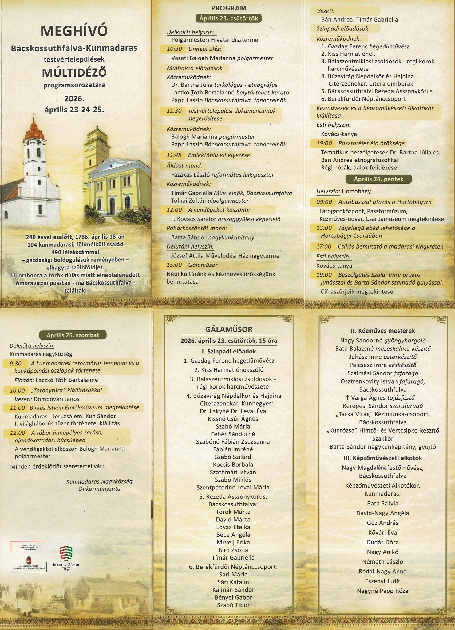 Kunmadaras Önkormányzata és a Birkás István Emlékmúzeum szervezésében a „240 éve Bácskossuthfalvára kitelepült kunmadarasiak emlékére” megrendezett 3 napos programsorozat, mely a két testvértelepülést és ott élők kapcsolatát hivatott még szorosabb kötelékké tenni. Emlékezet, a jelen valamint a jövő megteremtésének céljai, a közös út eléréséhez vezető feladatok átbeszélése, és a saját értékeik bemutatása és átadása egymásnak.