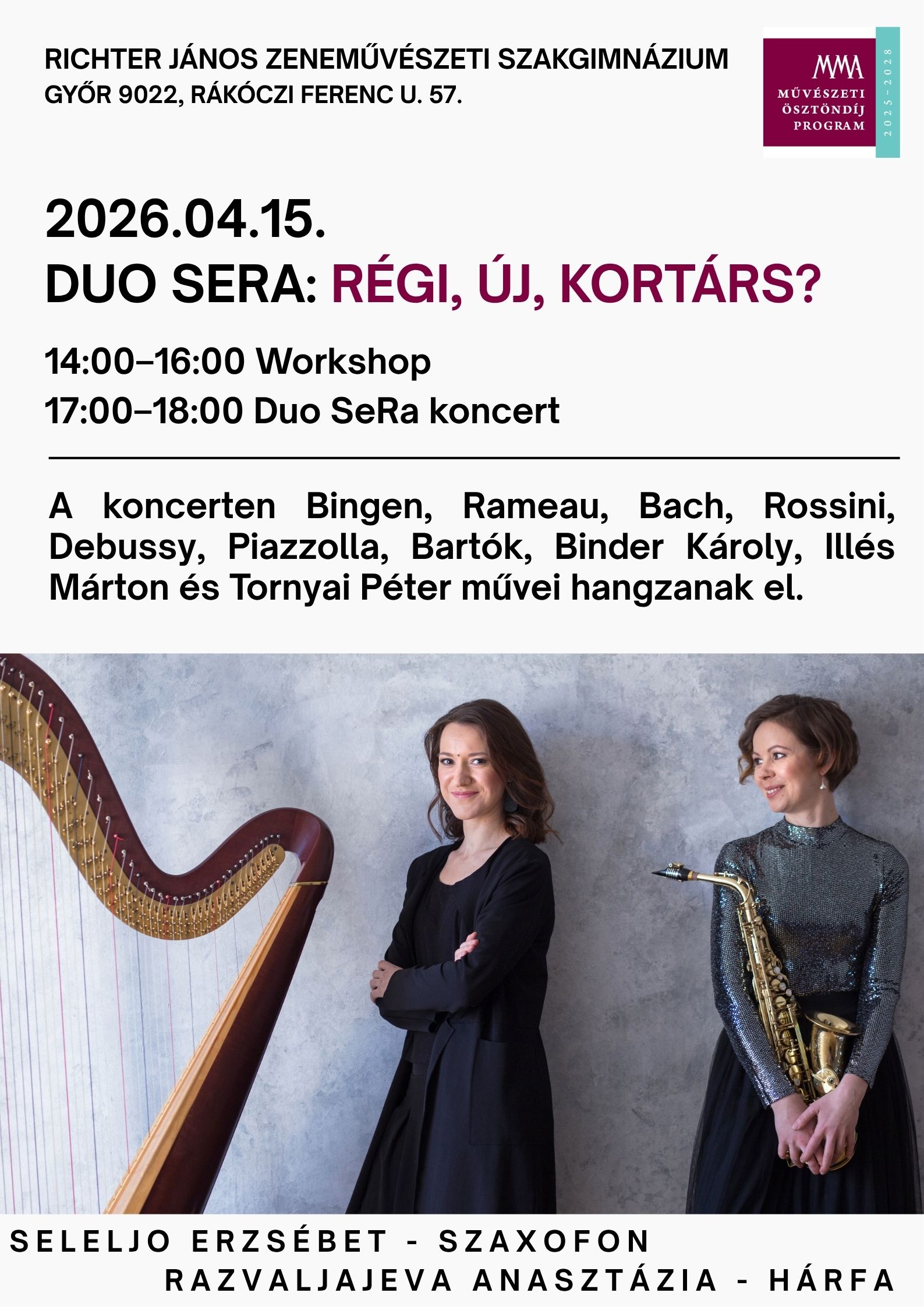 14:00 Workshop 17:00 Duo SeRa koncert a győri Richter János Zeneművészeti Szakgimnáziumban