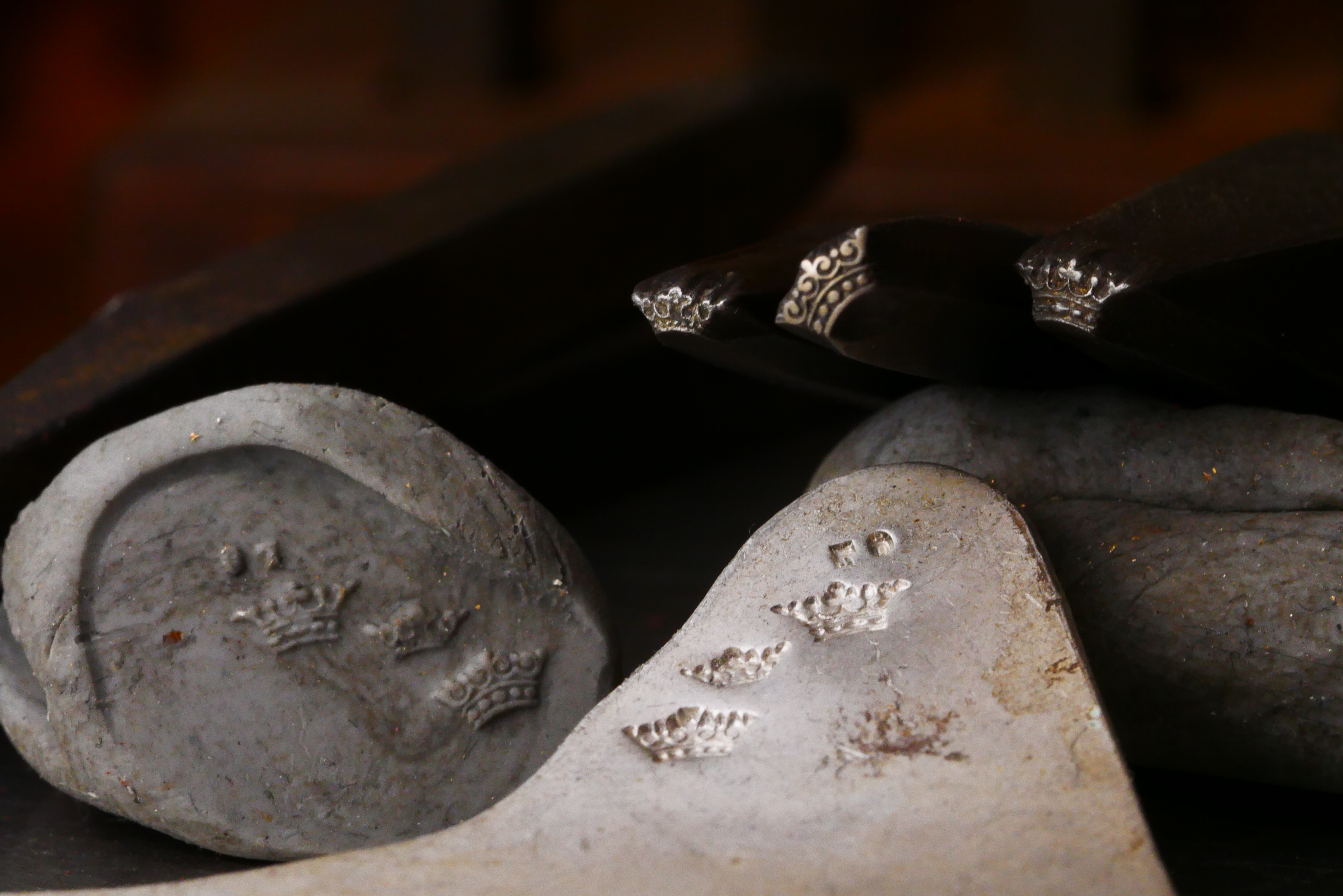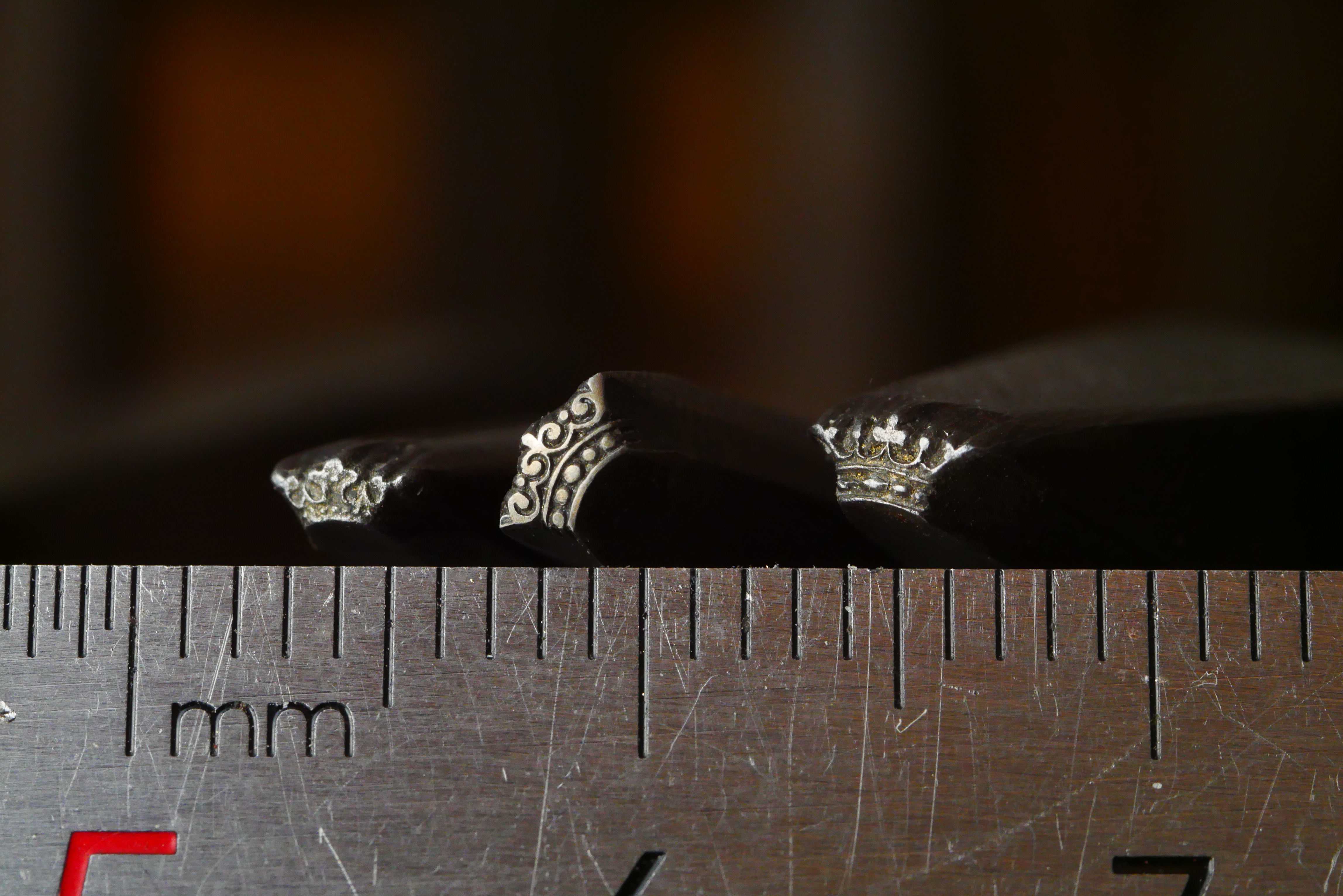 A készlet azóta a műhely aktív részévé vált: folyamatosan újítom fel a beütőket, a hiányzó vagy törött darabokat újrakészítem, és a közelmúlt munkáiban már alkalmaztam is őket, miközben saját mintás beütők készítésével is kísérletezem. A mellékelt képen látható korona beütők közül a középső saját készítésű darab.