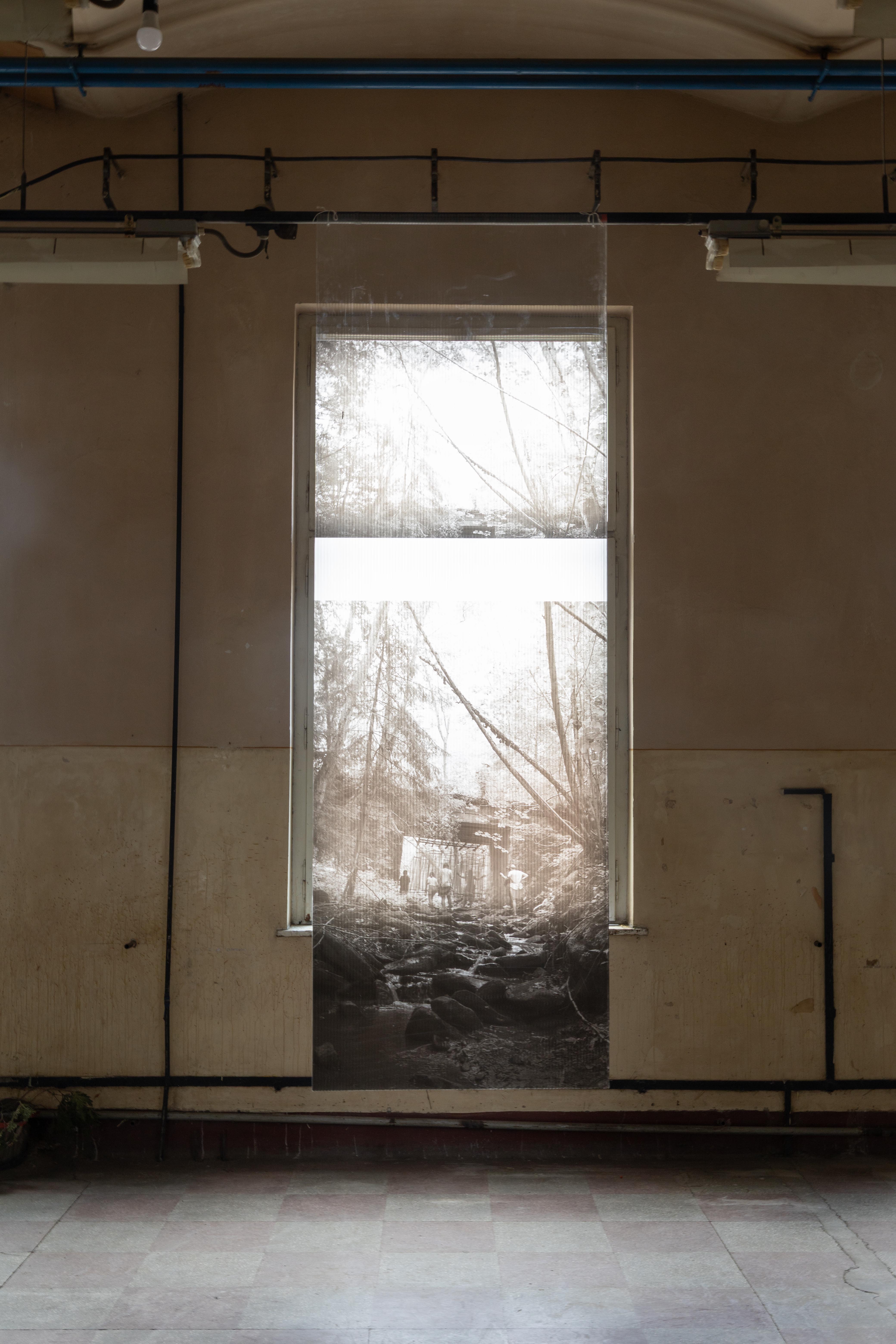 A kasírozott tartalom csak az ablakokkal szemben álló nézőpontból látható. A panelek másik oldala üres és erősen tükröződik a napfényben, ezért közvetlenül nem olvasható. Ez utóbbi nézőpont a paneleket egyszerű térelhatárolókként mutatja be, a teljes installációt pusztán építészeti térként jeleníti meg: a már meglévő építészeti rend kompozíciós sűrítéseként viselkedik.