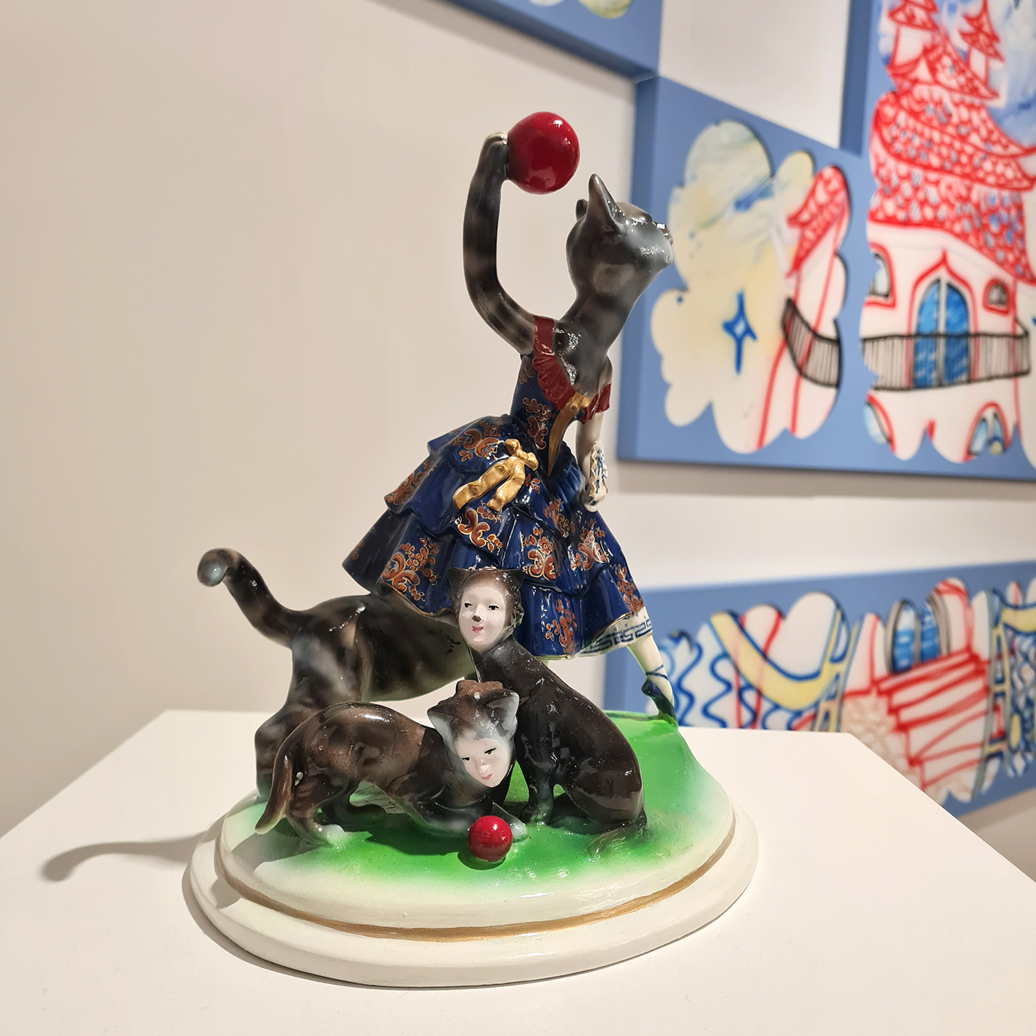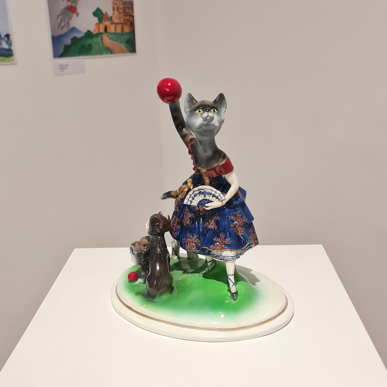 Petra Inez Combarro Macskacicó című porcelán szobra játékos, mitikus és finoman groteszk egyszerre; egy olyan meselény jelenik meg benne, amely egyszerre ismerős és bizarr.
