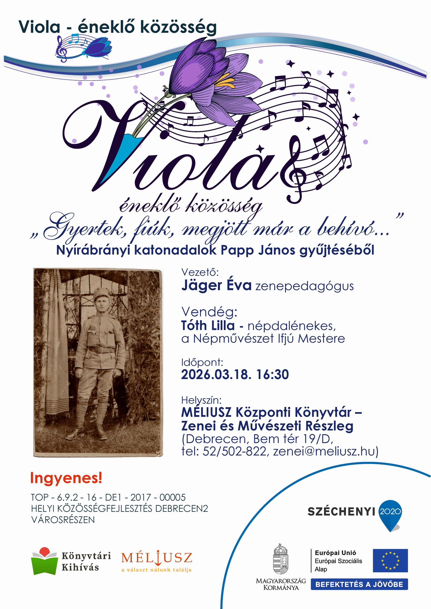 A Viola éneklő közösség havi rendszerességgel rendez zenei programokat a debreceni MÉLIUSZ Központi Könyvtár - Zenei és Művészeti Részlegében. 2026 márciusában Tóth Lilla adott koncertet a magyar nyelvterület katonadaliból válogatva. A program második felében daltanításra került sor: a közönség dr. Papp János etnográfus Nyírábrányban gyűjtött katonadalaiból ismerkedett meg egy csokorra valóval.