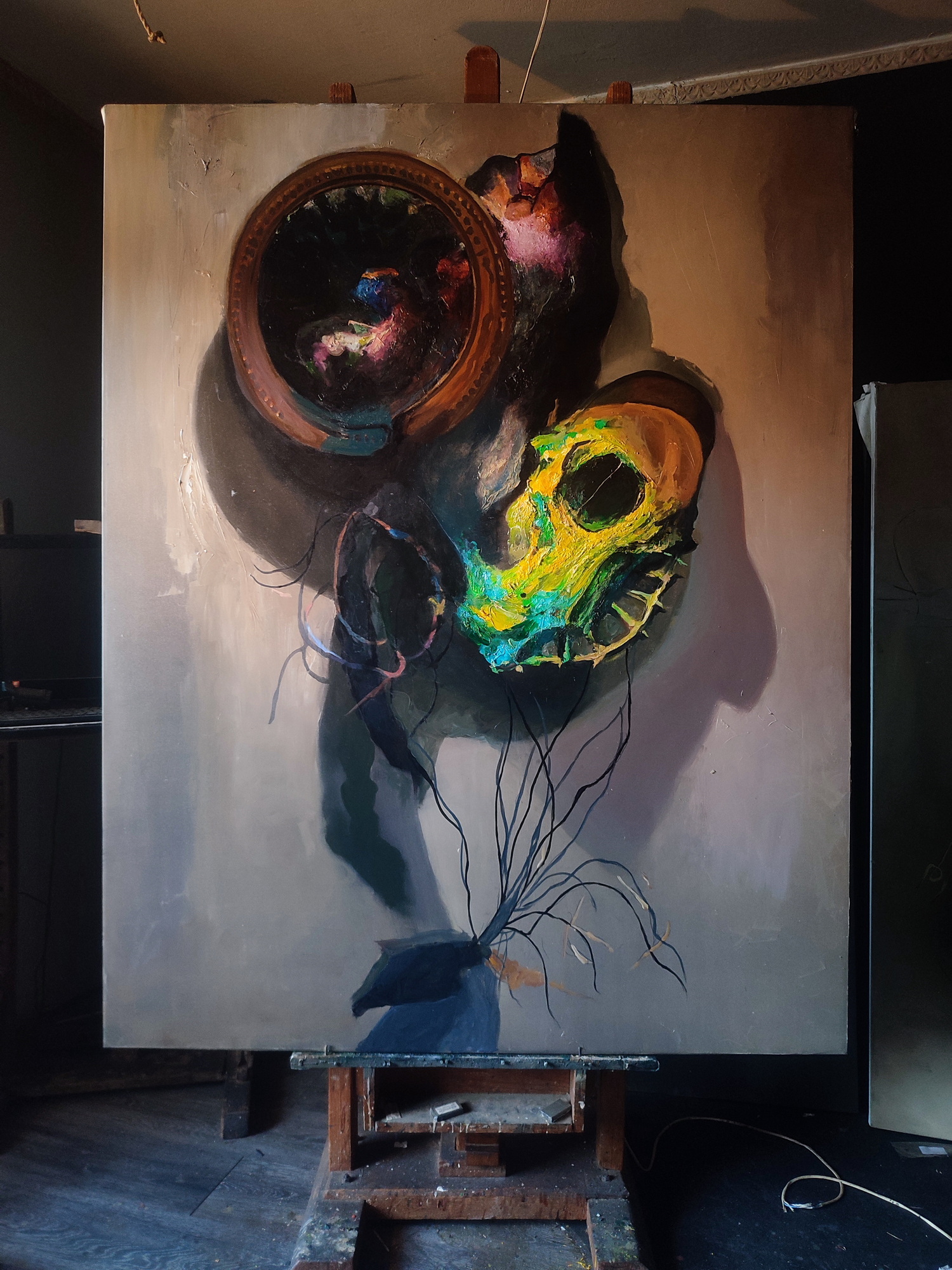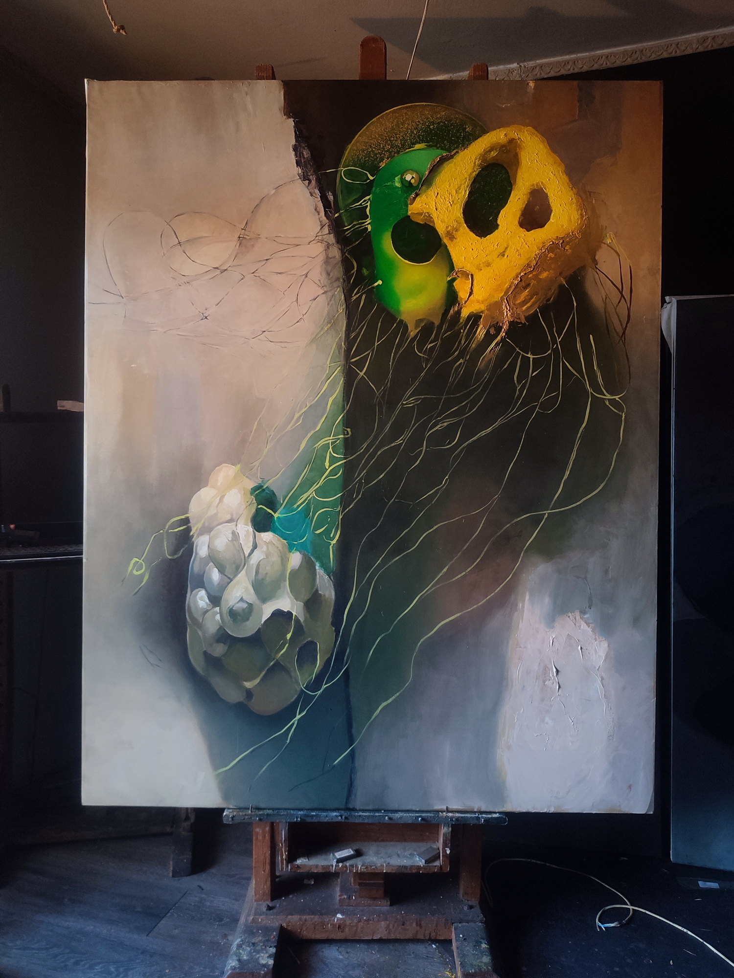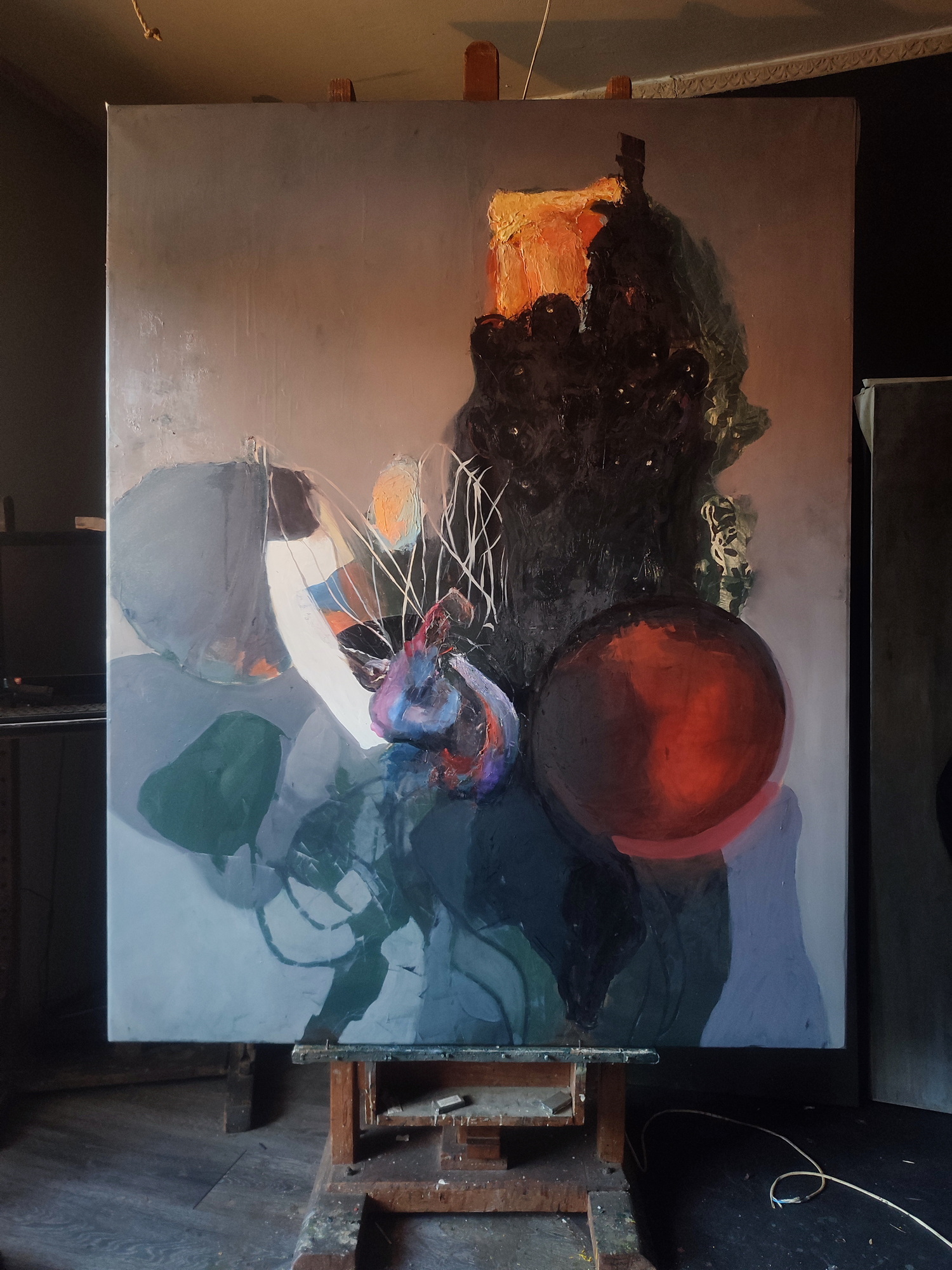 A munkafolyamatot a korábban kijelölt irányvonal mentén folytatom. Továbbra is a tárgyi absztrakció és a "tárgymemória" festői vizsgálatán dolgozom.