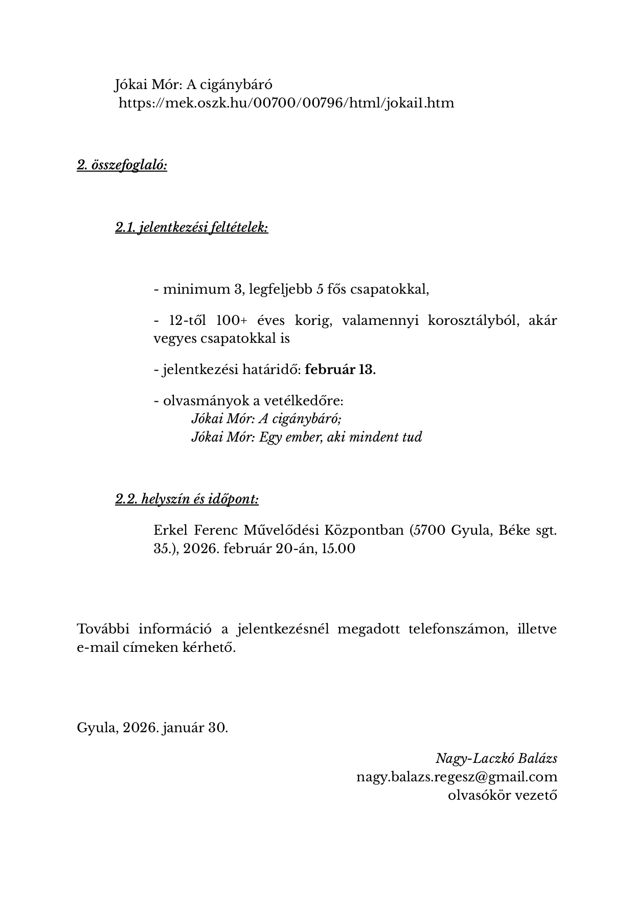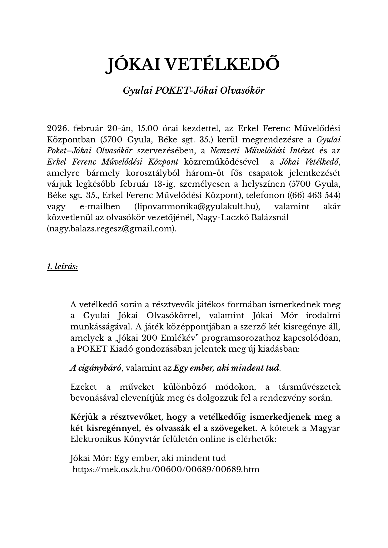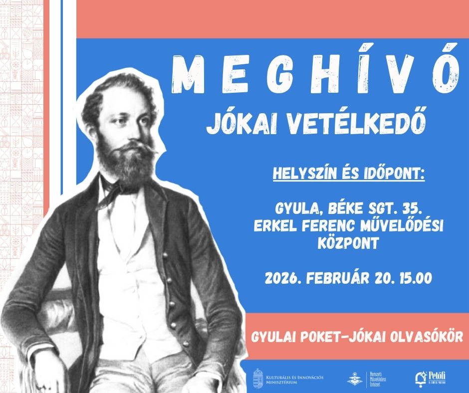 "2026. február 20-án, 15.00 órai kezdettel, az Erkel Ferenc Művelődési Központban (5700 Gyula, Béke sgt. 35.) kerül megrendezésre a Gyulai Poket–Jókai Olvasókör szervezésében, a Nemzeti Művelődési Intézet és az Erkel Ferenc Művelődési Központ közreműködésével a Jókai Vetélkedő, amelyre bármely korosztályból három-öt fős csapatok jelentkezését várjuk legkésőbb február 13-ig, személyesen a helyszínen (5700 Gyula, Béke sgt. 35., Erkel Ferenc Művelődési Központ), telefonon ((66) 463 544) vagy e-mailben (lipovanmonika@gyulakult.hu), valamint akár közvetlenül az olvasókör vezetőjénél, Nagy-Laczkó Balázsnál