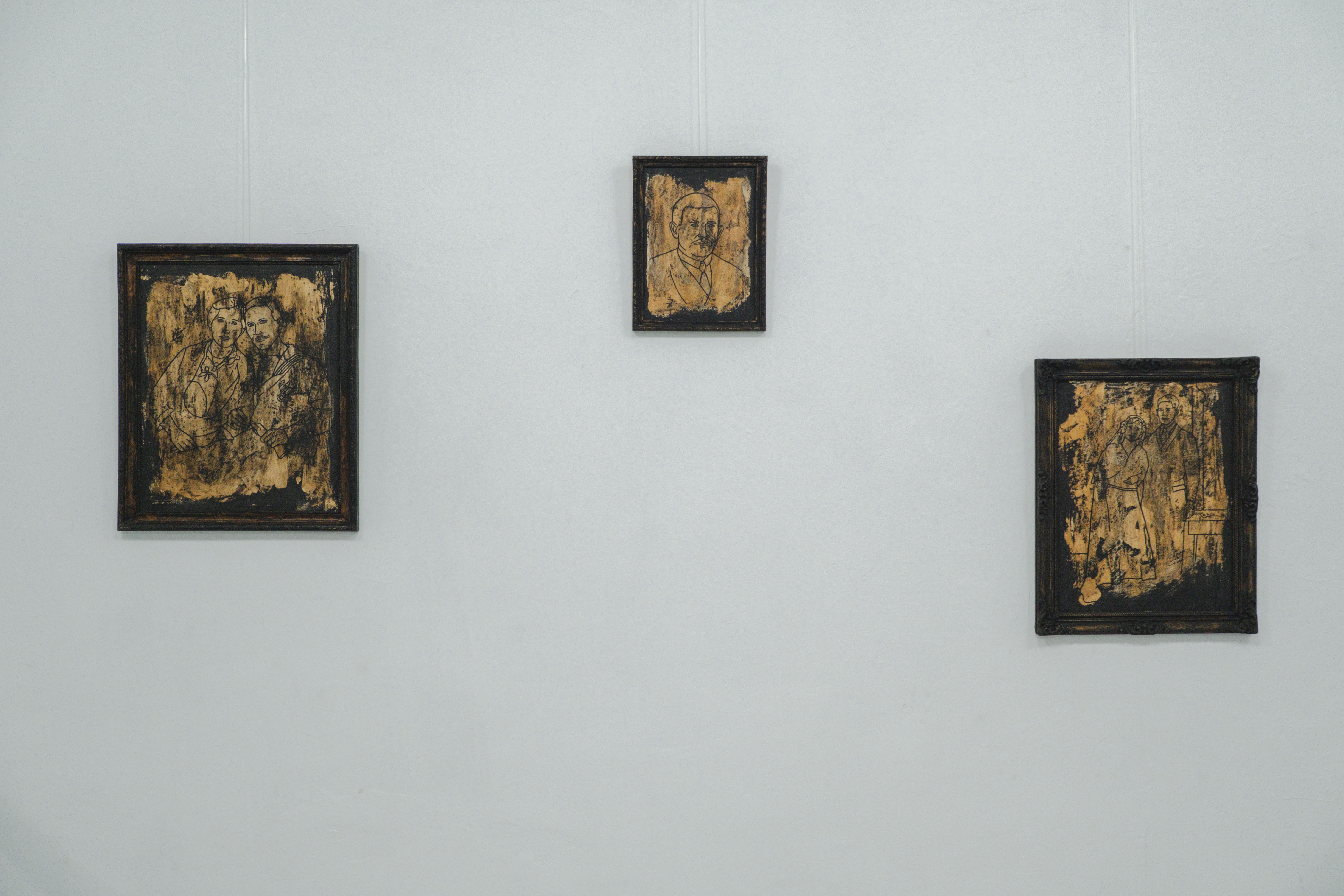 A viasz visszakaparása nem pusztán formai megoldás, hanem az emlékezés működésének pontos analógiája. A fedőréteg eltávolítása nem tiszta feltárást eredményez, hanem karcolt, hiányos, torz képet. A múlt nem egyszerre, nem teljességében jelenik meg, hanem megszakításokon és sérüléseken keresztül. A kép létrejötte így maga is kutatómunka: a felszín alól előhívott alakok az emlékezet bizonytalan, gyakran fájdalmas rekonstruálását idézik. A filc, kávé és tempera által létrejövő foltok és tónusok nem restaurálják a fényképeket, inkább a romlás, az idő munkáját hangsúlyozzák.