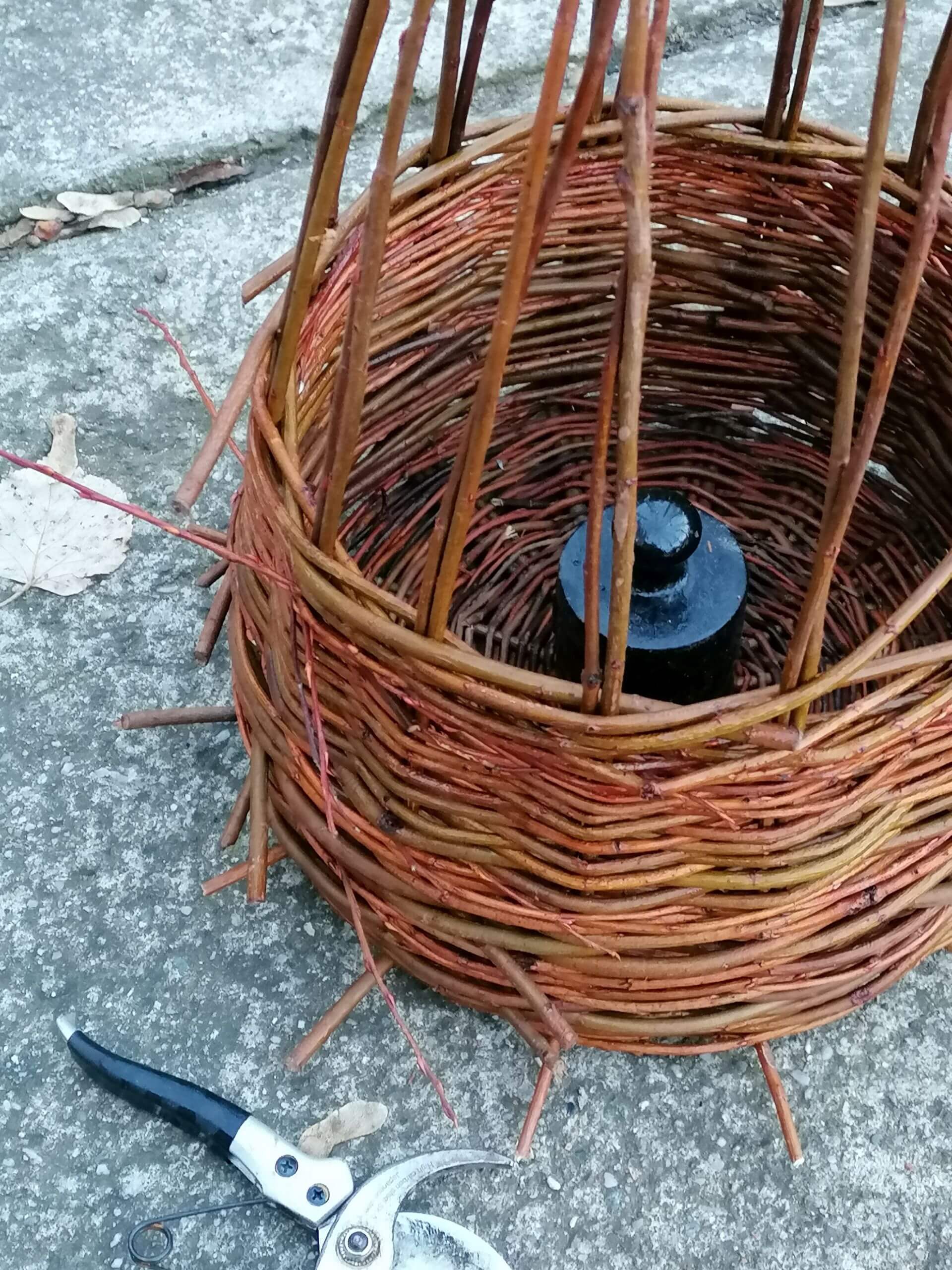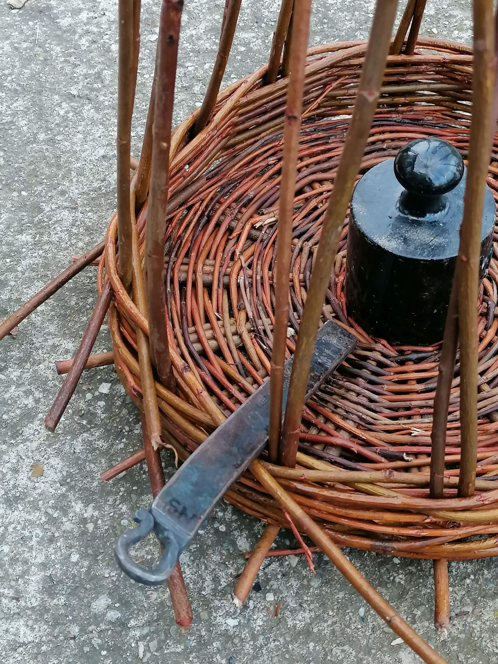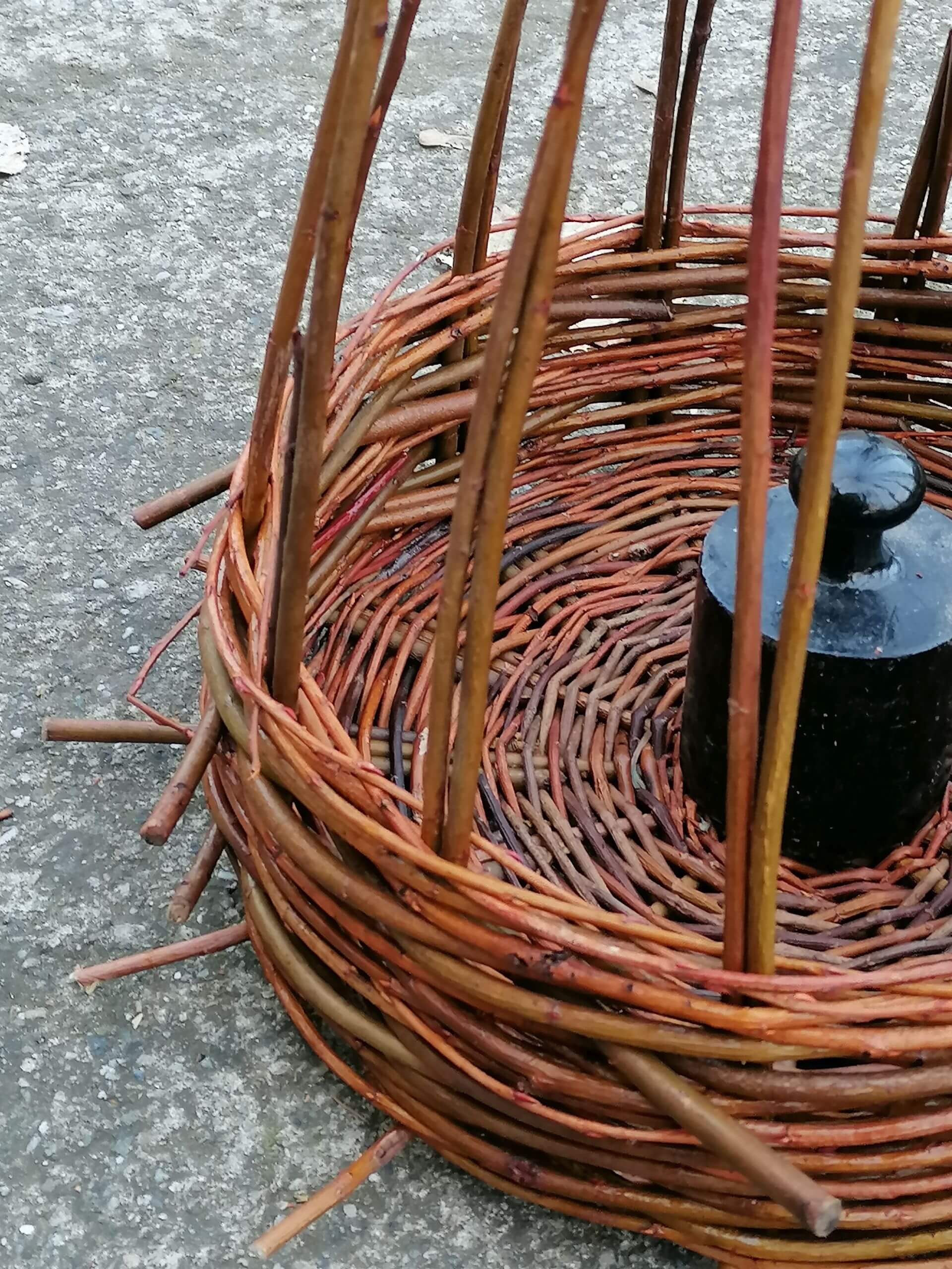 Alapanyagként főként fűzvesszőt használok, de próbálkozom a kúpok oldalfalába más szálas anyagok (pl. somvessző, aranyeső, díszfüvek) befonásával is, amik díszítik, változatosabbá teszik ezeket a tárgyakat. A fonástechnikákat is igyekszem variálni.