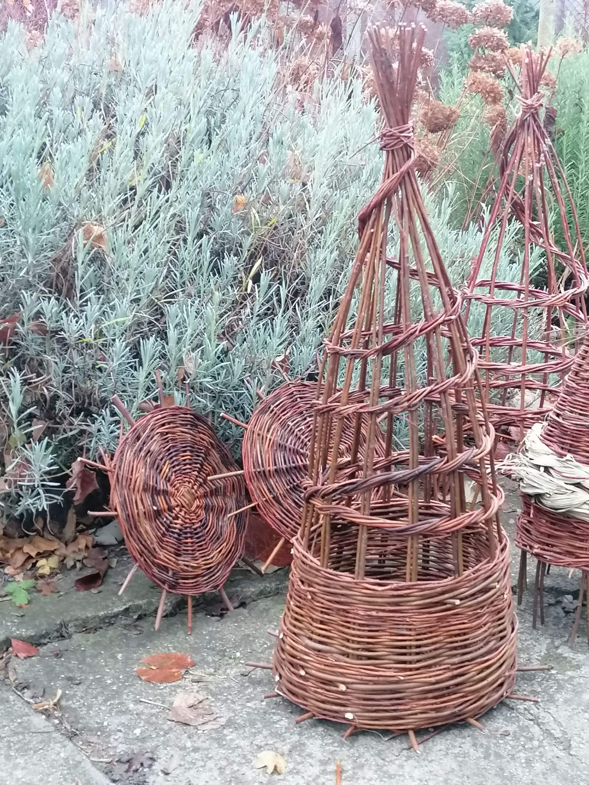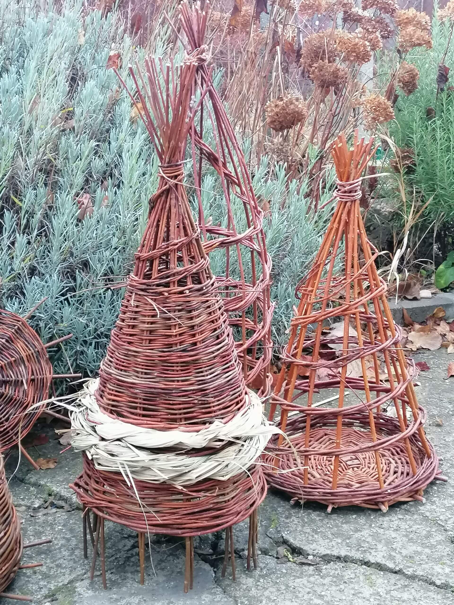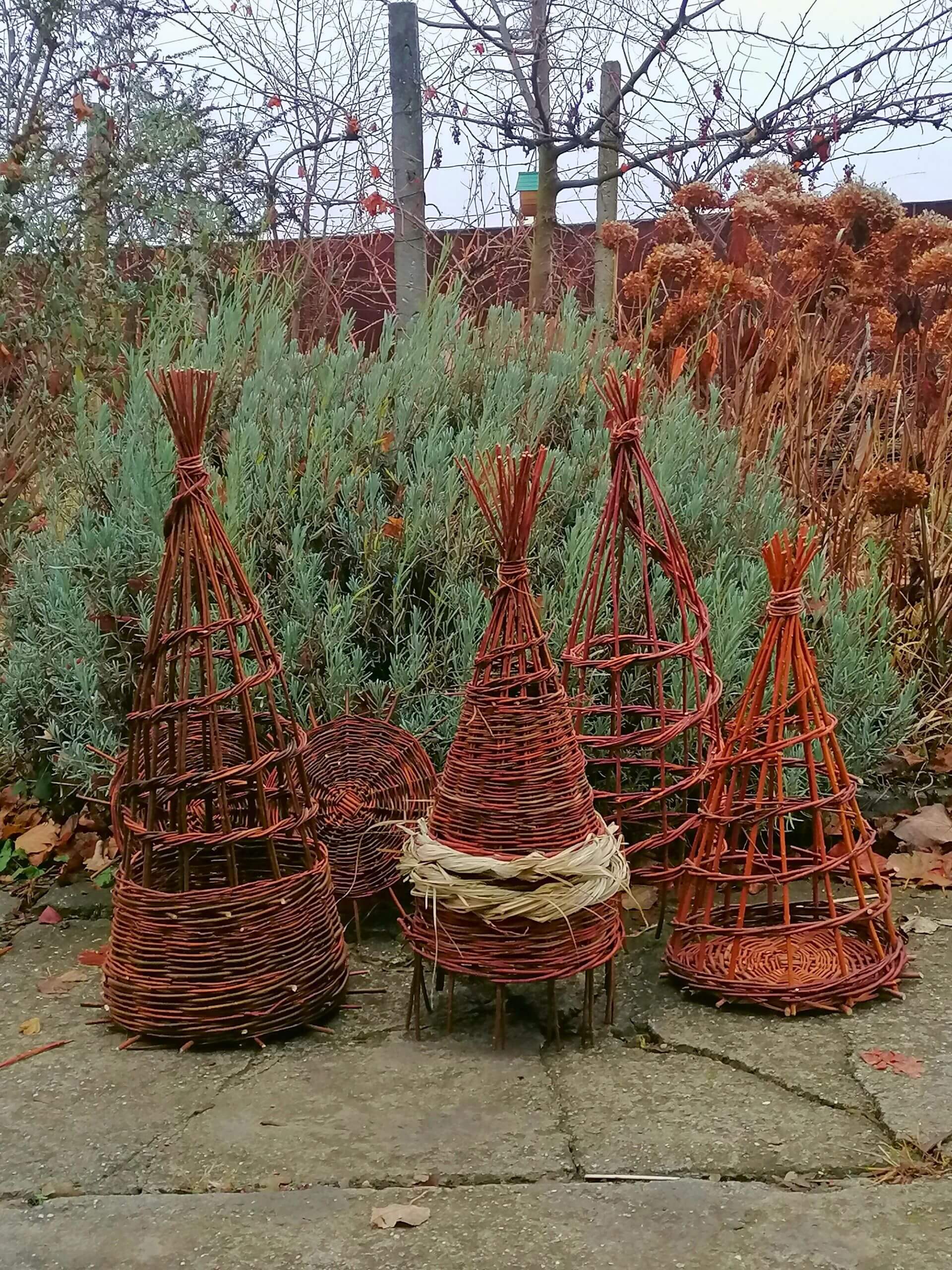 Egy részük alj nélkül készül sablon segítségével, hogy aztán földbe szúrható legyen a kertben vagy egy nagyobb cserépben. Másik részük a kerek kosarakhoz használatos kerek aljra épül, így önállóan stabilan áll a tárgy egy asztalon vagy padlón is. Kültéri díszítő funkcióban az aljra tehető nehezékkel további stabilitást lehet adni a szerkezetnek.