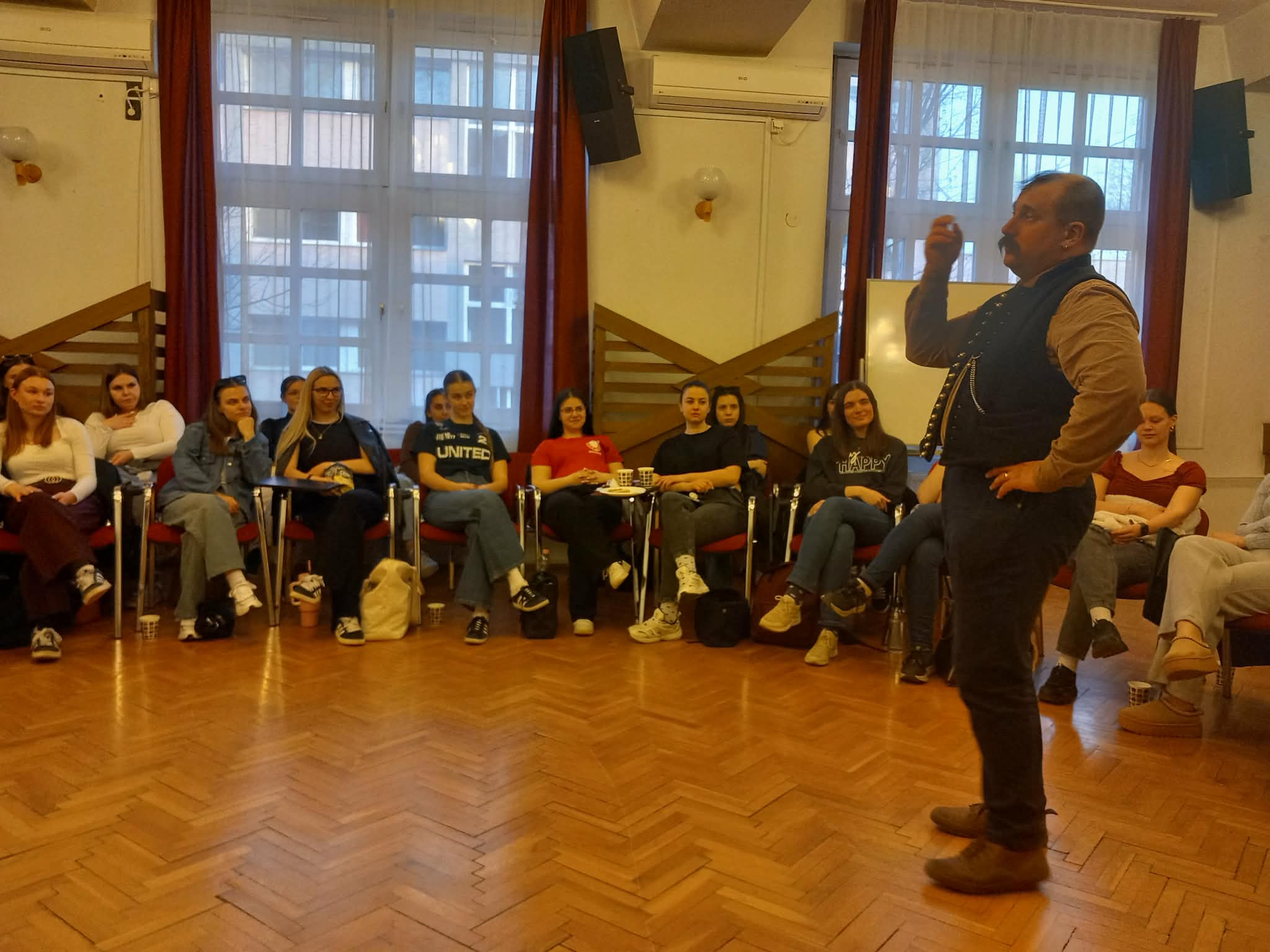 - Március 18-án egy különleges kezdeményezés részese voltam. A Debreceni Egyetem Gyermeknevelési és Gyógypedagógiai Karának meghívására Uhrin Anikó mesemondó társammal együtt mesekört tartottunk elsőéves óvodapedagógus hallgatóknak. Több, mint 70 hallgató vett részt az alkalmon, ahol mesemondással és szakmai tapasztalatok átadásával igyekeztünk közelebb hozni a mesék világát és az élőszavas mesemondás műfaját a leendő óvodapedagógusokhoz. A kezdeményezés sikert aratott, így április 22-én újabb mesekörben gyűlnek össze az érdeklődő egyetemisták, hogy folytassuk a megkezdett munkát.