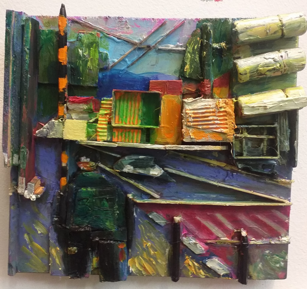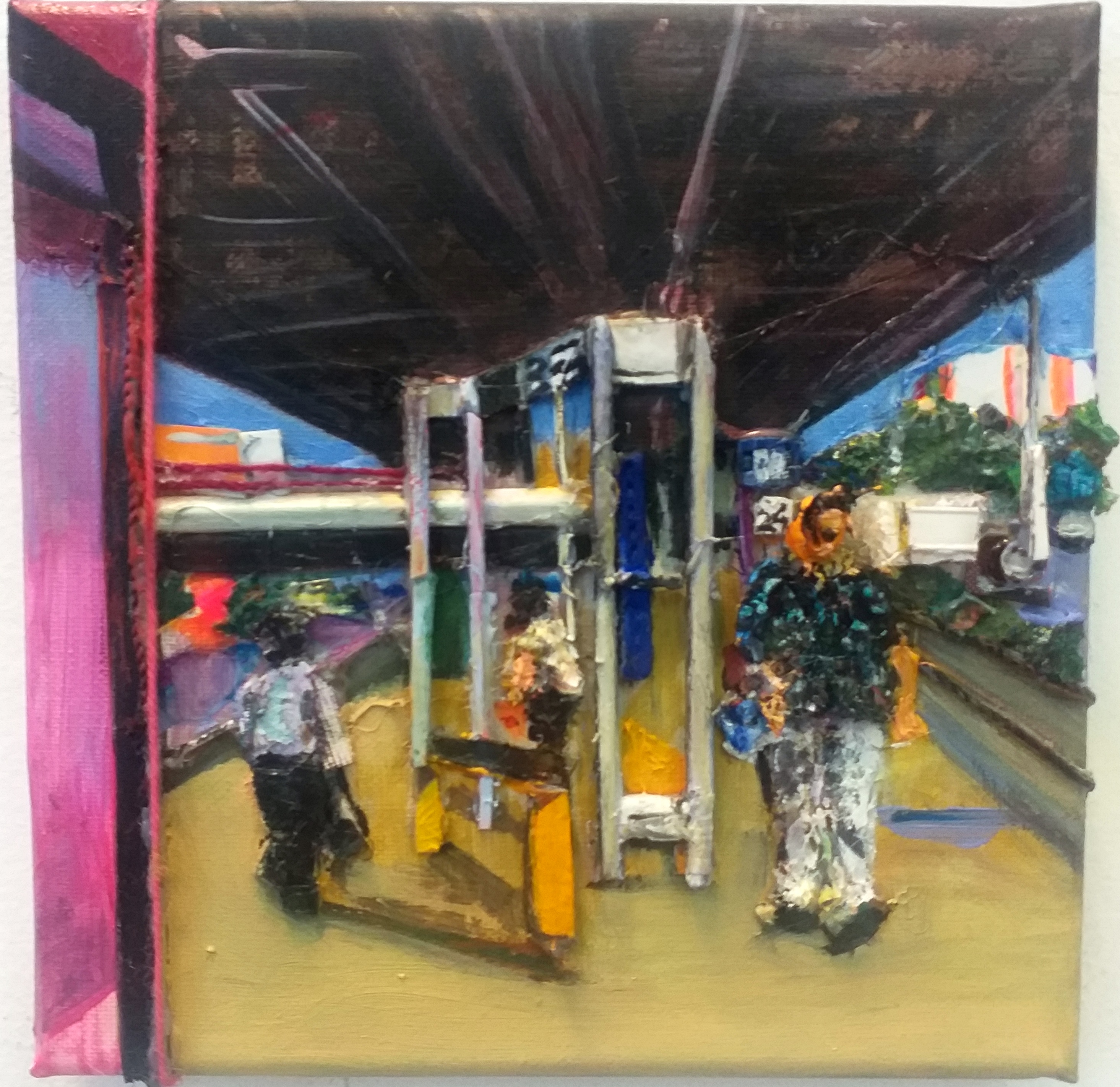 A vásáron két képemmel veszek részt: Rendőrpalota előtt, 20 x 20 cm, olaj, kollázs, vászon, 2025 és az Utcám Brassóban, 27 x 27 cm, olaj, assamblage, deszka, 2023-as munkámmal.