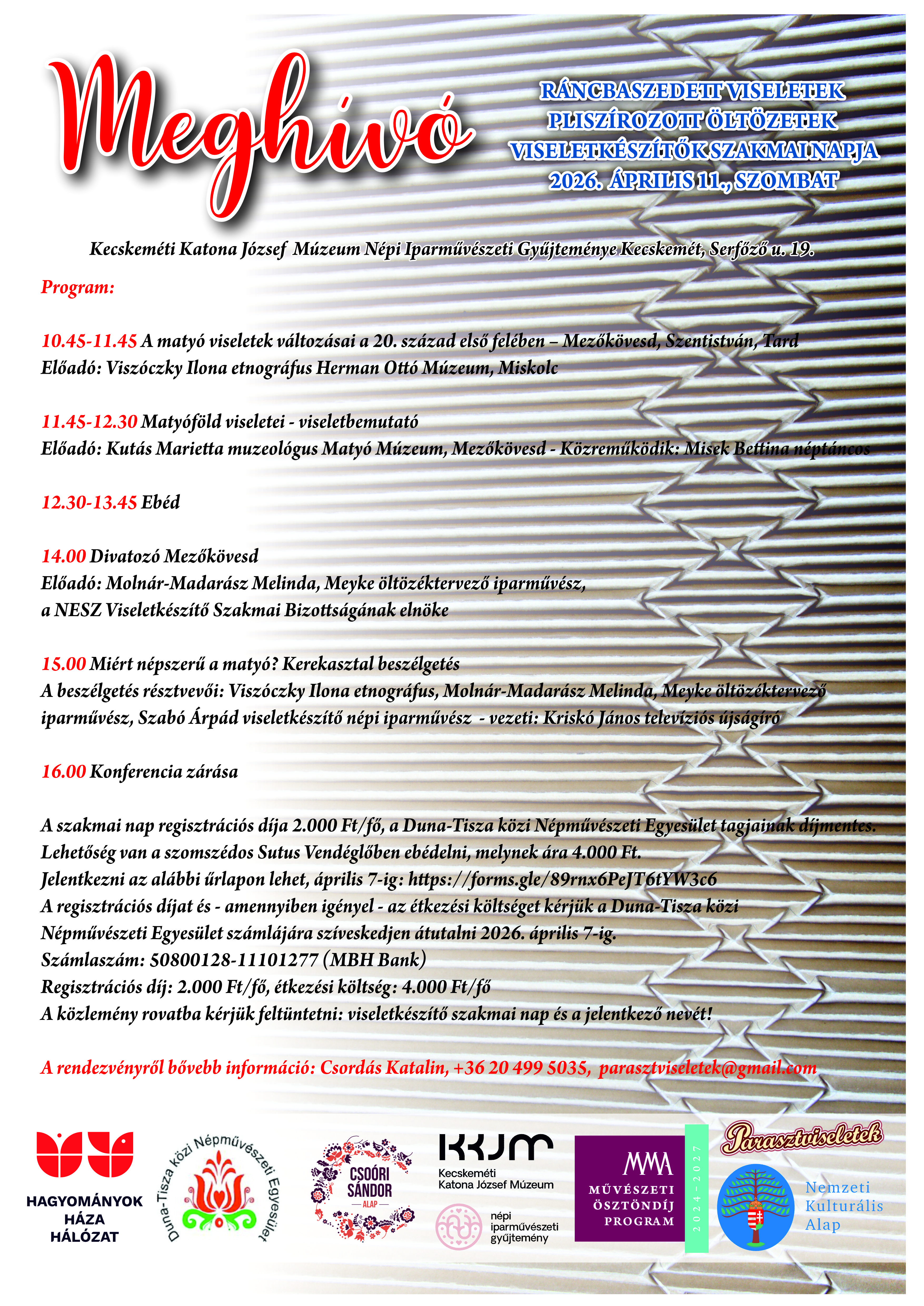 Szeretettel várjuk a viseletkészítőket és minden kedves érdeklődőt a kiállítás megnyitójára és viseletkészítő szakmai napunkra 2026. április 11-én 10.00 és 16.00 óra között a Kecskeméti Katona József Múzeum Népi Iparművészeti Gyűjteményébe!