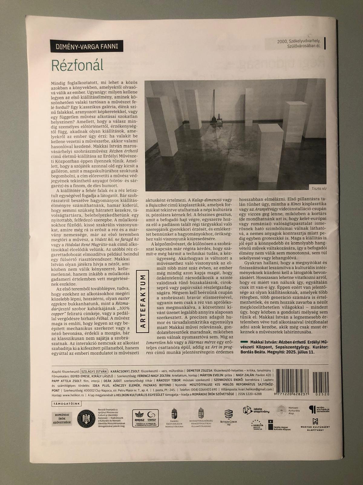 A kritika a Rézben érthető című kiállításról (Erdélyi Művészeti Központ) született. A lapszámot a kiállítás képanyagával illusztrálták.
