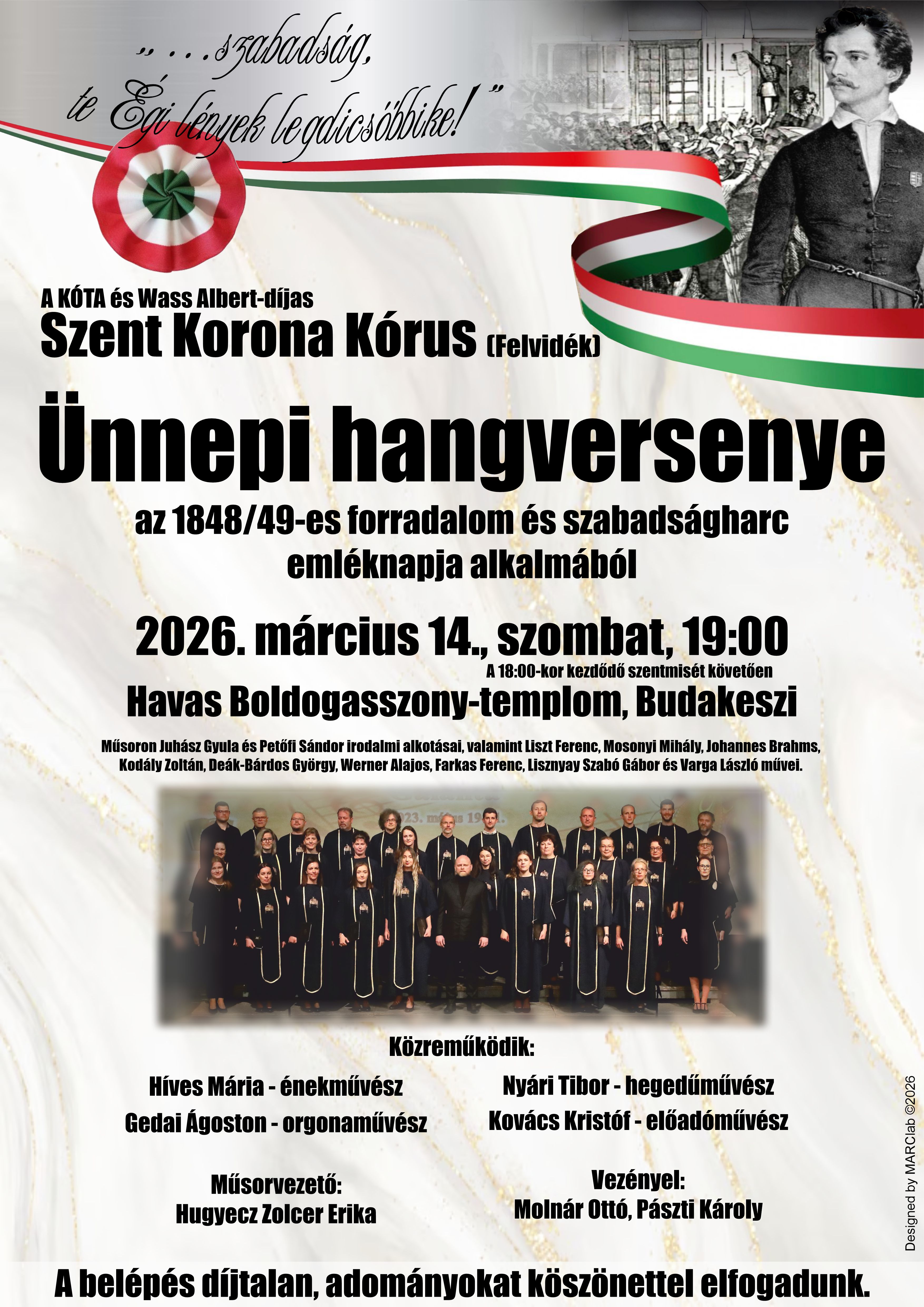 Március 14-én, szombaton 19:00 órai kezdettel Budakeszin a Szent Korona Kórus és művészbarátai a forradalom és szabadságharc emléknapja alkalmából ünnepi hangversenyt adnak.