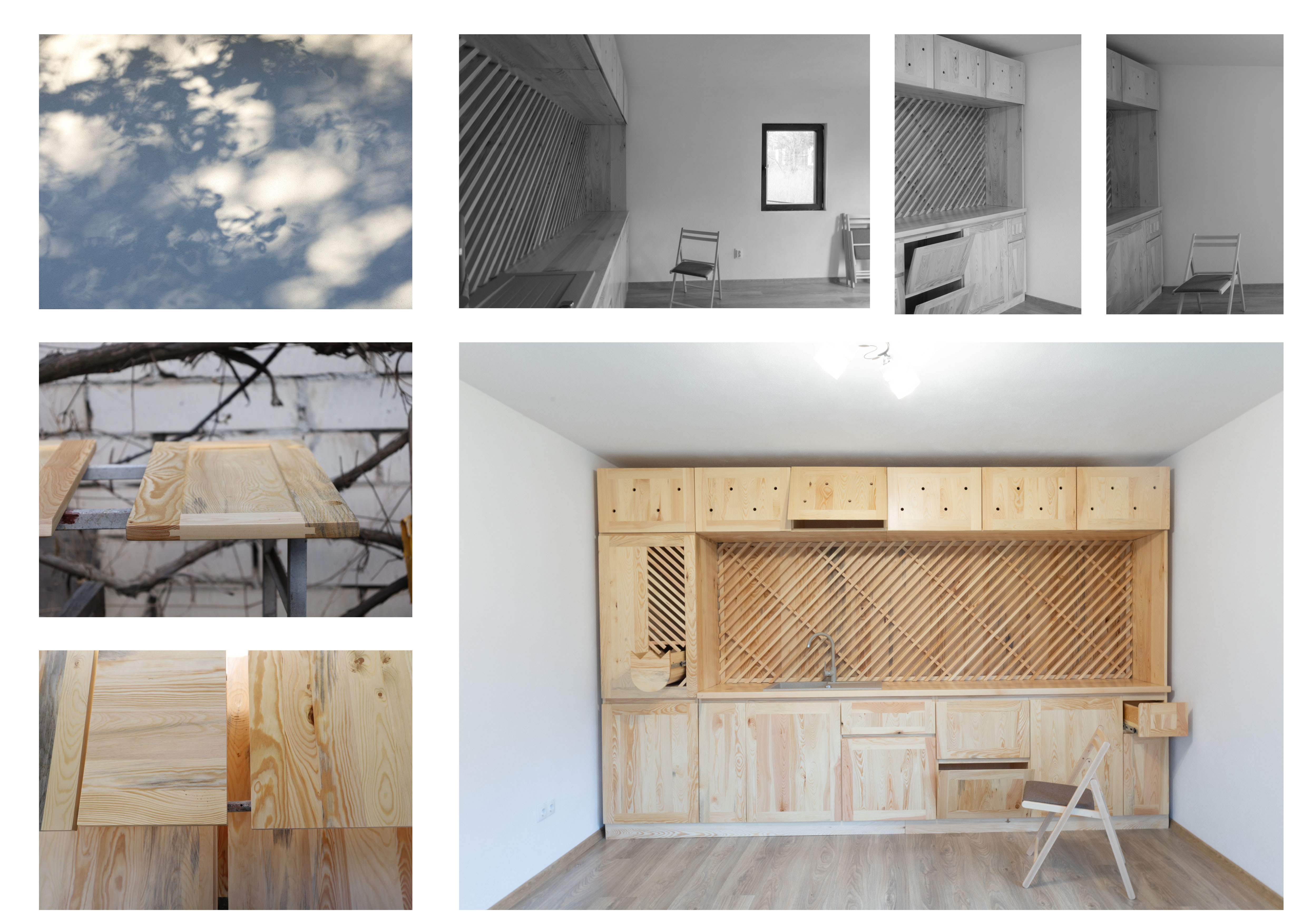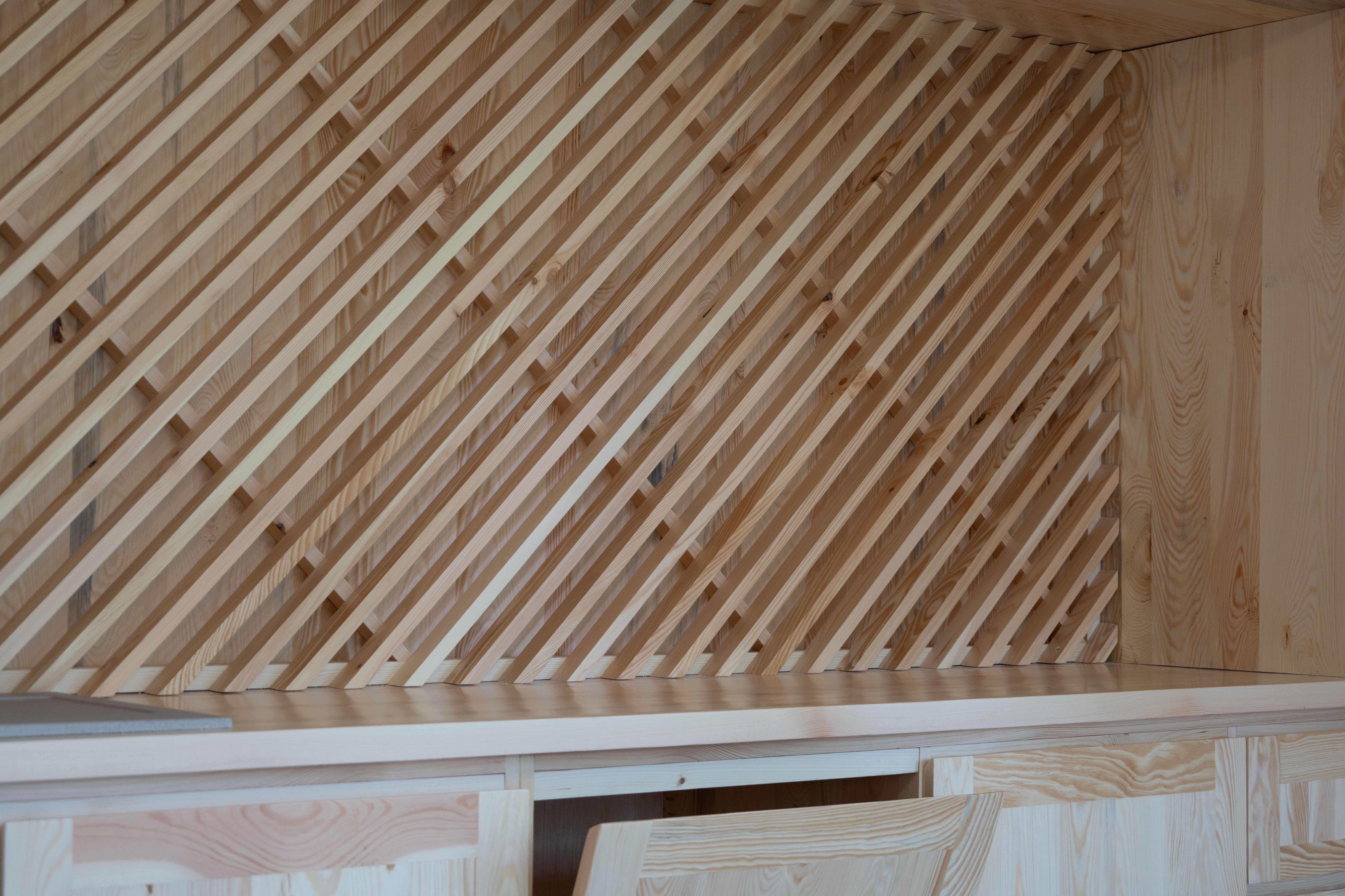 Tervezés során a hagyományos és kortárs faépítészeti megoldások, a lombkoronák ritmusos mozgása, házfalra vetülő fény-árnyékok, nyíló kapuk, ajtók, ablakok, minimális csavarozás, homogén anyaghasználat, és az egymás mellé helyezett deszkák váltakozó mintázatainak a szabályos keretbe foglalása inspirált: tömör fa felületek kötött kompozíciója, mint a régió táji atmoszférájának a sűrítménye. A bútor félévig tartó gondolkodó, rajzoló fázis után 2025 tavaszán készült el.