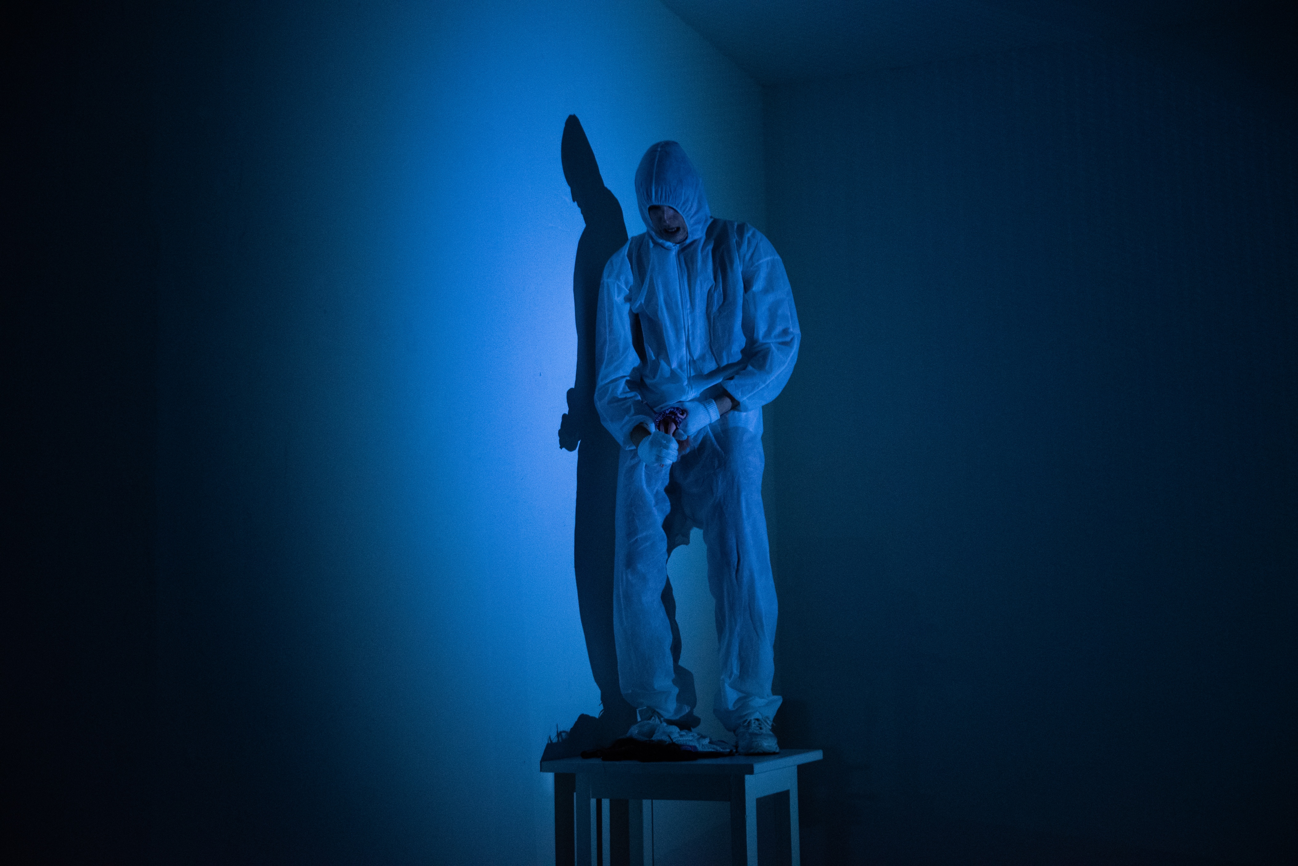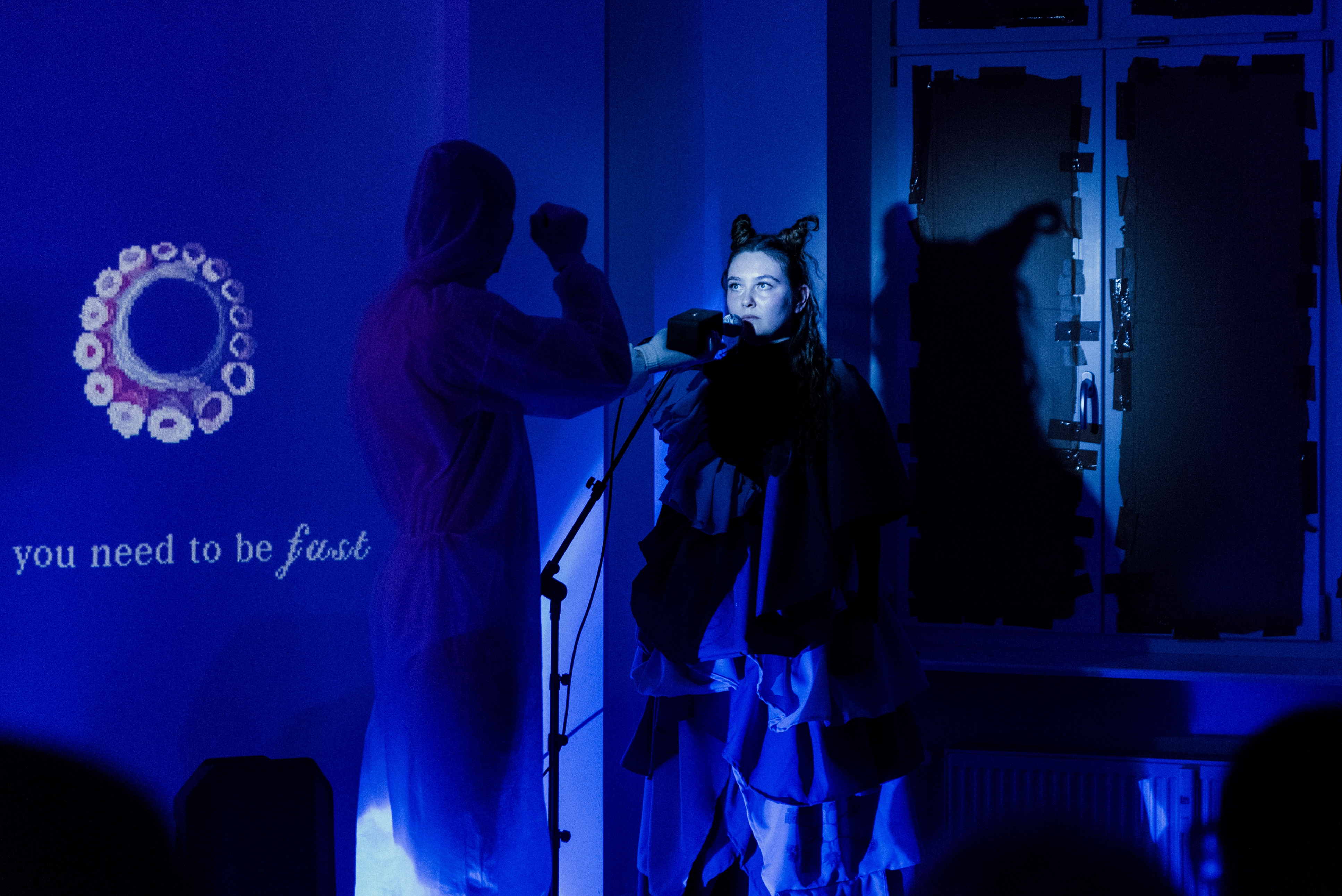 Interdiszciplináris performansz az AI veszélyeiről és a digitális manipulációról, egy algoritmus által vezérelt dramaturgiában.