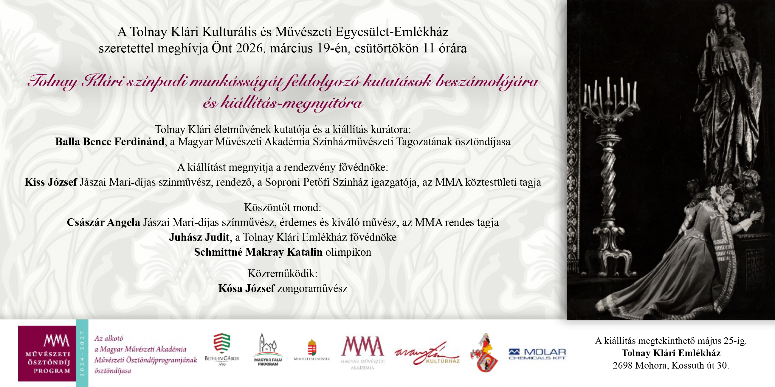 Tolnay Klári színpadi munkásságát feldolgozó kutatások beszámolója és kiállítás-megnyitó Mohorán.