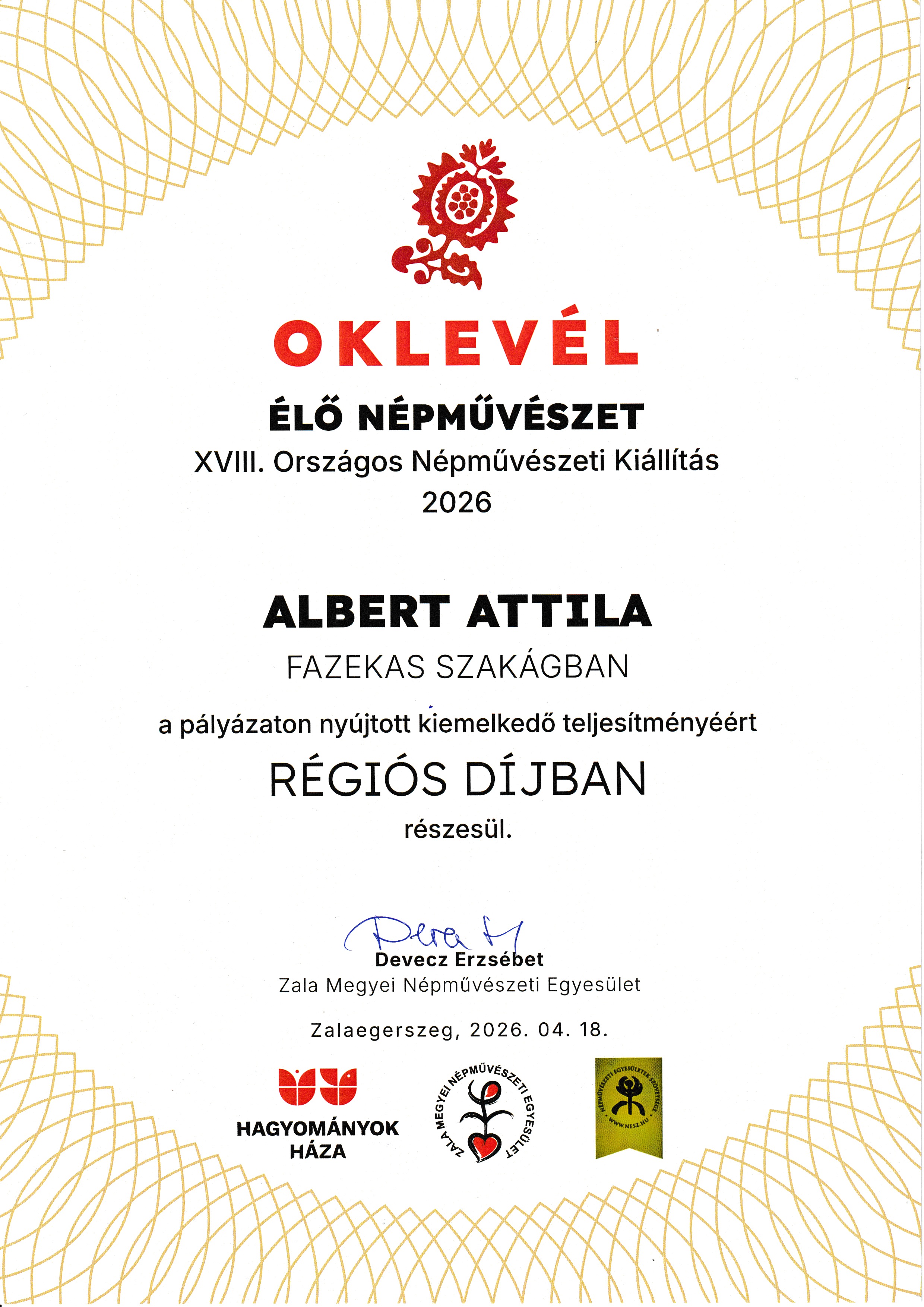 2026 április 18-án Zalaegerszegen a MIndszentyneumban megnyílt a XVII. Országos Élő Népművészet Kiállítás nyugat-dunántúli regionális kiállítása. A Zsűri értékelése alapján - egyéni és közösségi kategóriában - régiós díjban részesültem, és alkotásaim az országos összesítő kiállításban is megmérettetnek. A regionális tárlat, augusztus 23-ig megtekinthető.