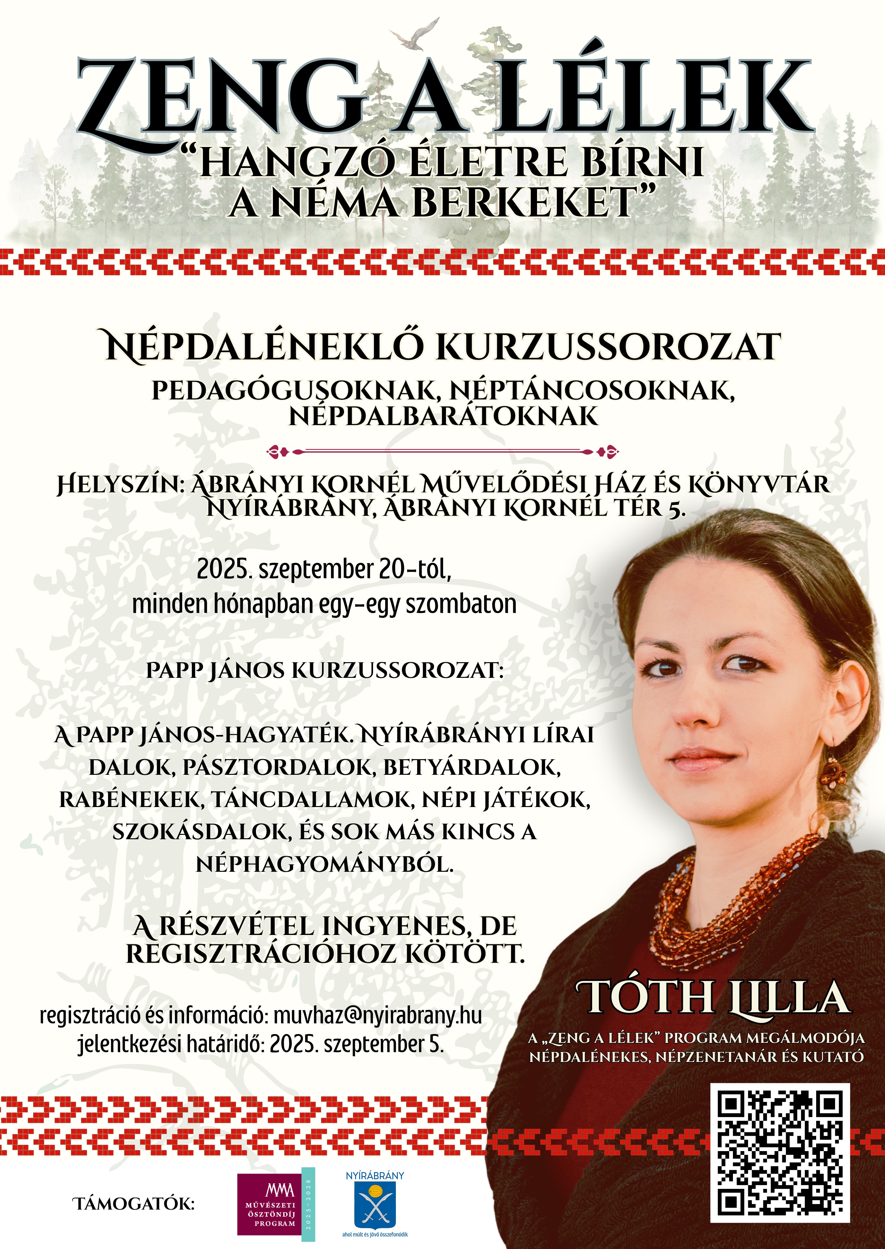 Pályázati programom címe: Zeng a lélek – „hangzó életre bírni a néma berkeket”. A doktori kutatásom során került a látóterembe dr. Papp János etnográfus hagyatéka. Ez a gyűjtemény alkalmas arra, hogy reprezentatív módon mutassa be nemcsak a hajdúsági népdalkészletet, de a bihari és a nyírségi dallamanyagot is. A Zeng a lélek program három szakaszból áll. Az első szakasz központja Papp János szülőfaluja, Nyírábrány, a második és harmadik szakasz Hajdúböszörményben, illetve Berettyóújfaluban várható. A program szerint havi rendszerességű kurzusok valósulnak meg, a tananyagot az adott szakasz elejére elkészített, kistájanként mintegy 100 dallamos válogatás adja. A Zeng a lélek program mindhárom szakasza egy-egy gálakoncerttel zárul. Pályázatom elsődleges célja az, hogy a népdalok hazaérjenek, visszajuthassanak a nyírségi, hajdúsági, bihari települések lakóinak mindennapi életébe. Ennek érdekében dolgozom a Papp János hagyatékából származó felvételek gondozásán, a dallamok életre keltésén, a helyi értékek visszatanításán.